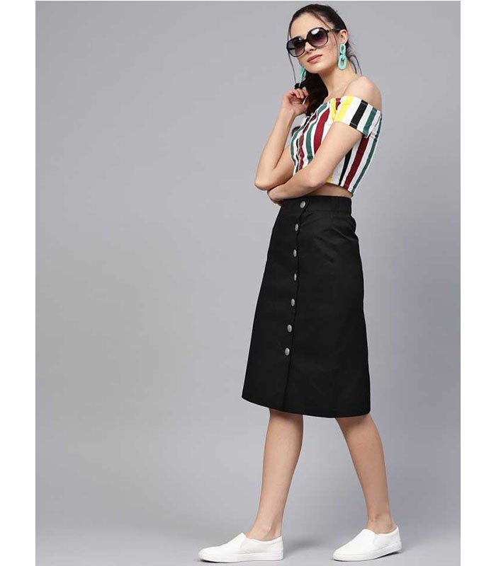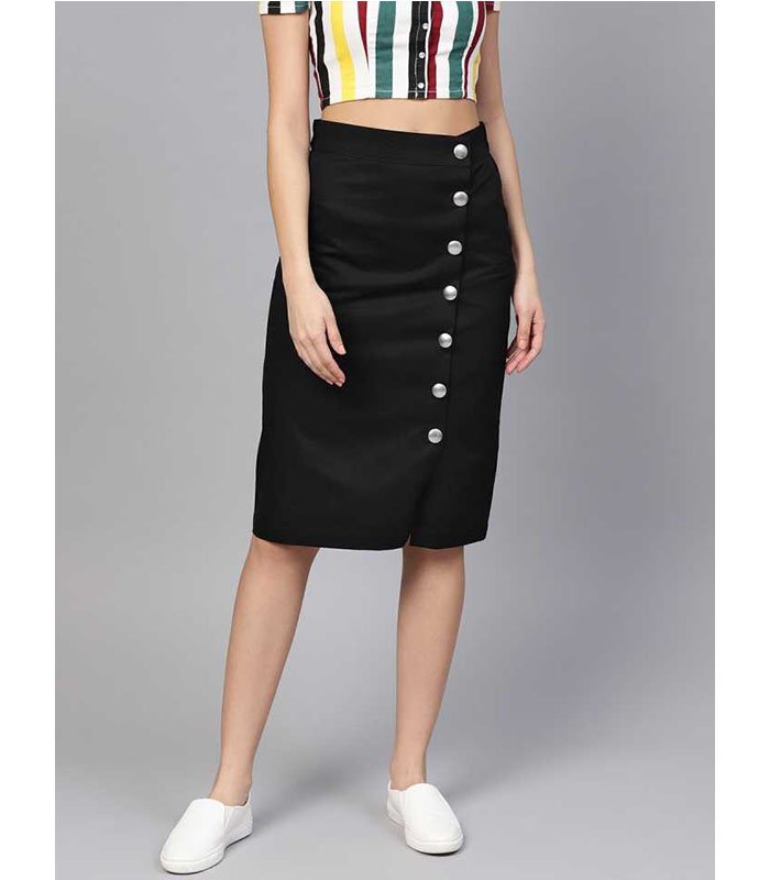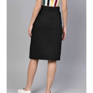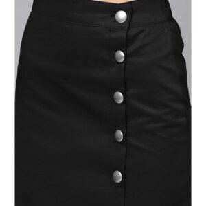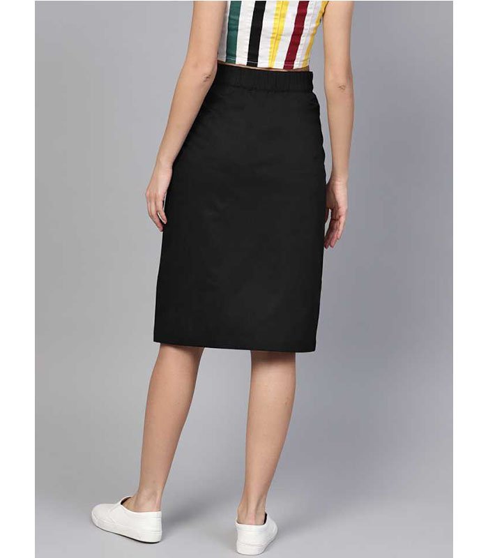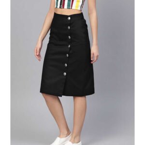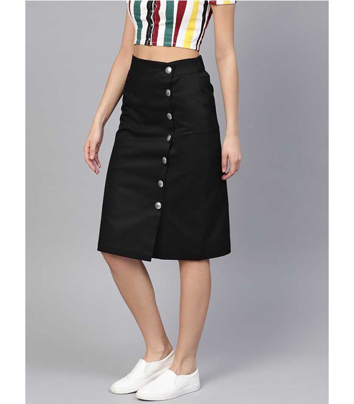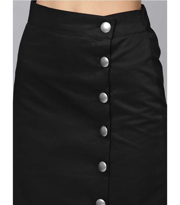 Black solid woven A-line skirt, has a partially elasticated waistband with full button placket, a slit on the front, flared hem